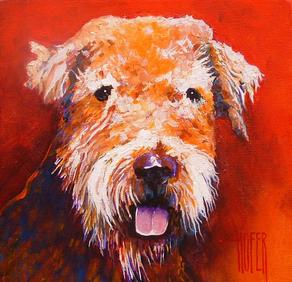 "I saw Ed's dog paintings at a dog show while visiting North Carolina. He had a large painting which looked like my beloved Airedale. Knowing that I was heading back home and could not fit the large painting in my car, I commissioned Ed to do a smaller head shot, similar to the large airedale painting he had on display. Ed made the whole process very easy and I couldn't wait to get my "Brutus" shipped to me. Even though I still grieve, many years after losing him, I can't express how much I love having this painting of his sweet face. Ed, you did a fantastic job of capturing his expression that I adored. Thank you."